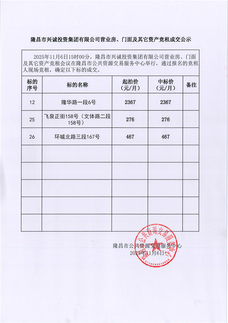 LCJY(2025)C077隆昌市兴诚投资集团有限公司营业房、门面及其它资产竞租成交公告